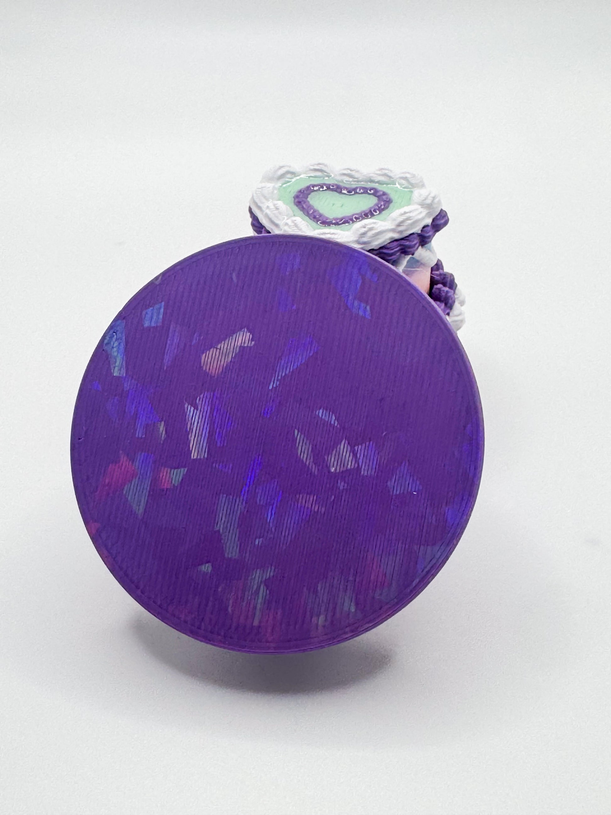 Double layer cake clicker that comes with it's own stand! Stand printed on an iridescent plate to give is a fun iridescent finish. Top of the clicker hand coated in UV resin.